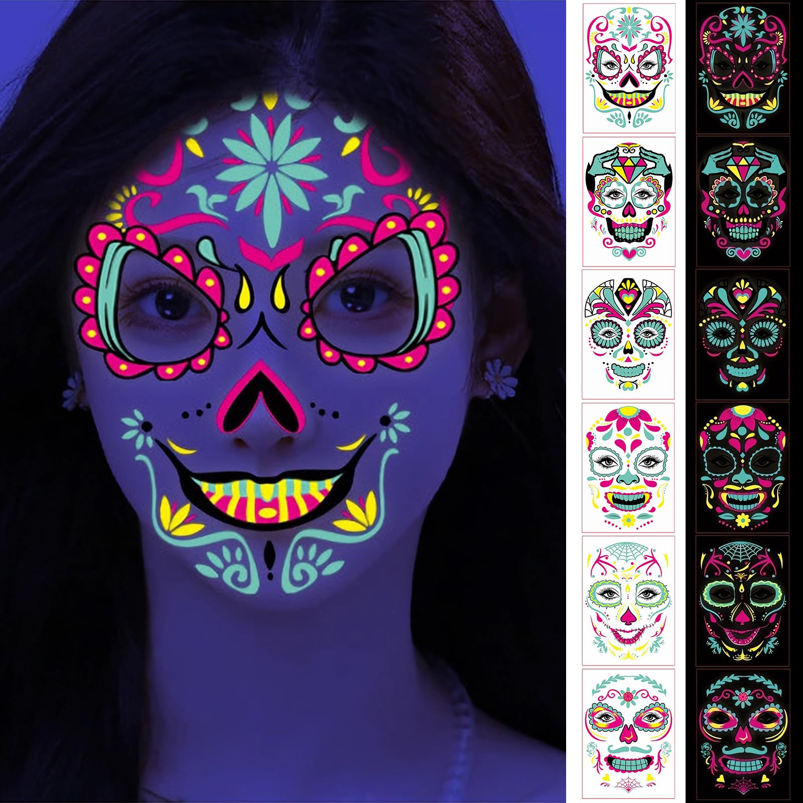 【数量限定】【LEISURE CLUB】ハロウィン タトゥーシール ハロウィン シール フェイス 顔全体 蛍光シール ぴかぴか光る 夜光タトゥーステッカー フェイスステッカー ハロウィン 文化祭 バー 学園祭 パーティー コスプレ 防水 (6枚セット) | libertyislan