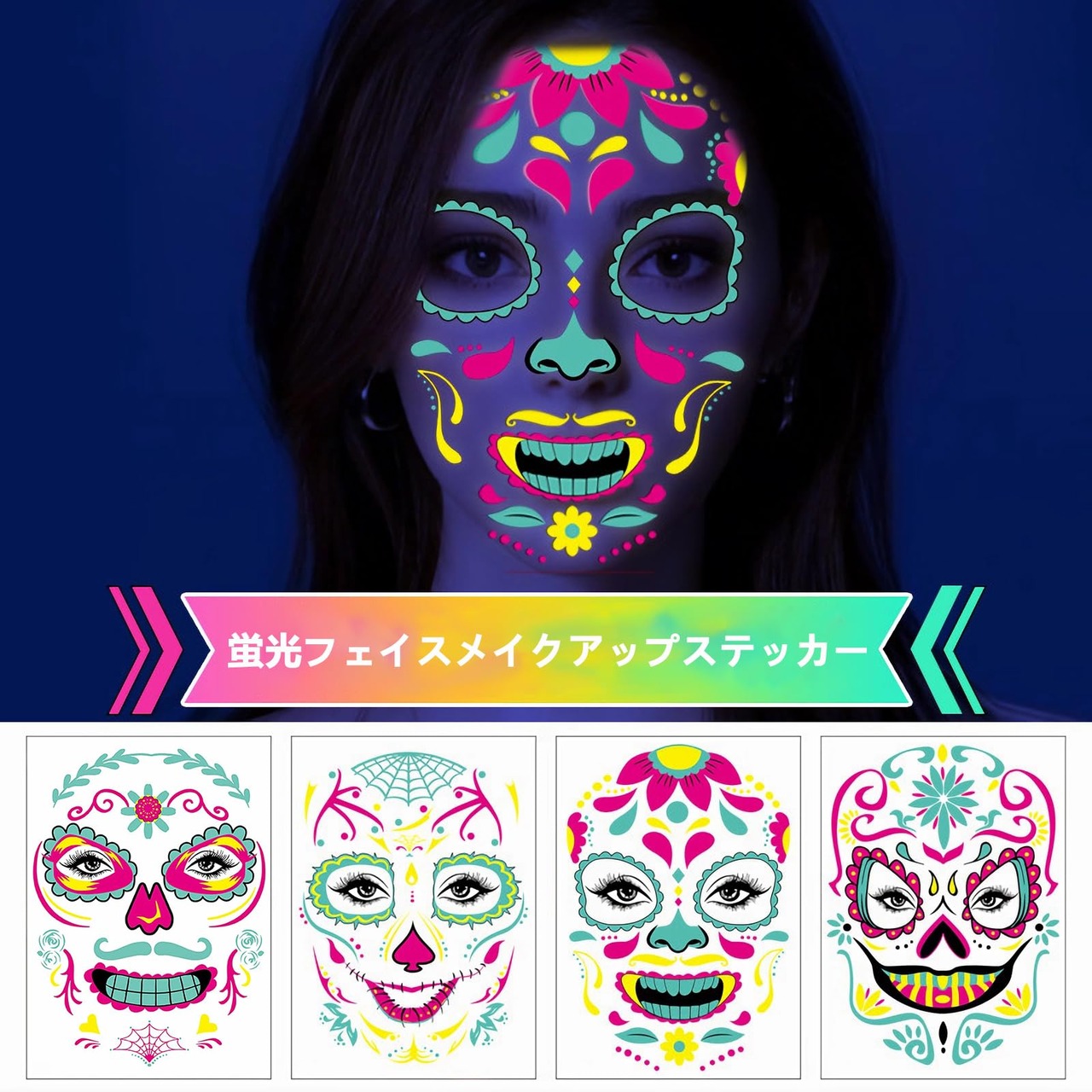 ハロウィン タトゥーシール ハロウィン シール フェイス 顔全体 蛍光シール ぴかぴか光る 夜光タトゥーステッカー フェイスステッカー ハロウィン 文化祭 バー 学園祭 パーティー コスプレ 防水 6枚セット