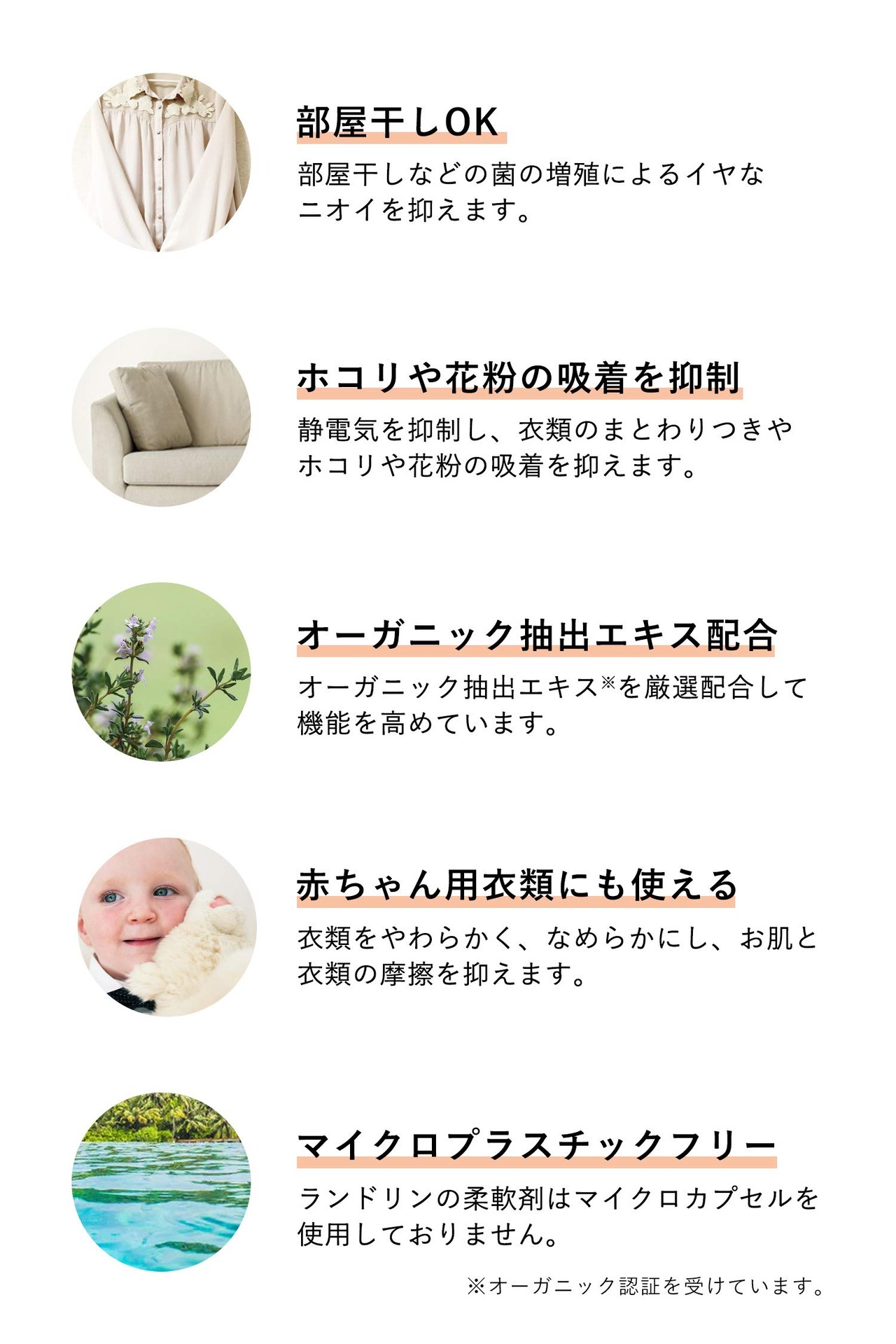 オーガニック成分配合で赤ちゃん用衣類にもご使用いただけます。
