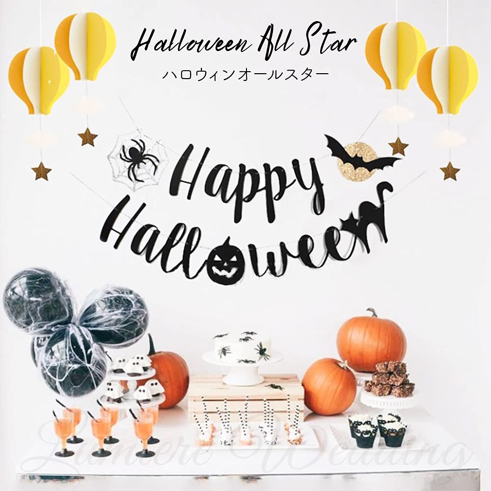 【Halloweenガーランド】バルーンなどの大掛かりなデコレーションをしないくてもハロウィンムードを簡単にお楽しみいただけるおしゃれガーランド。オシャレなスクリプトフォントのHappy Halloweenにスパイダー、ジャックオーランタン、ブラックキャット、バット、満月、とハロウィンには欠かせないアイテムを全て盛り込んだハロウィンオールスター。
