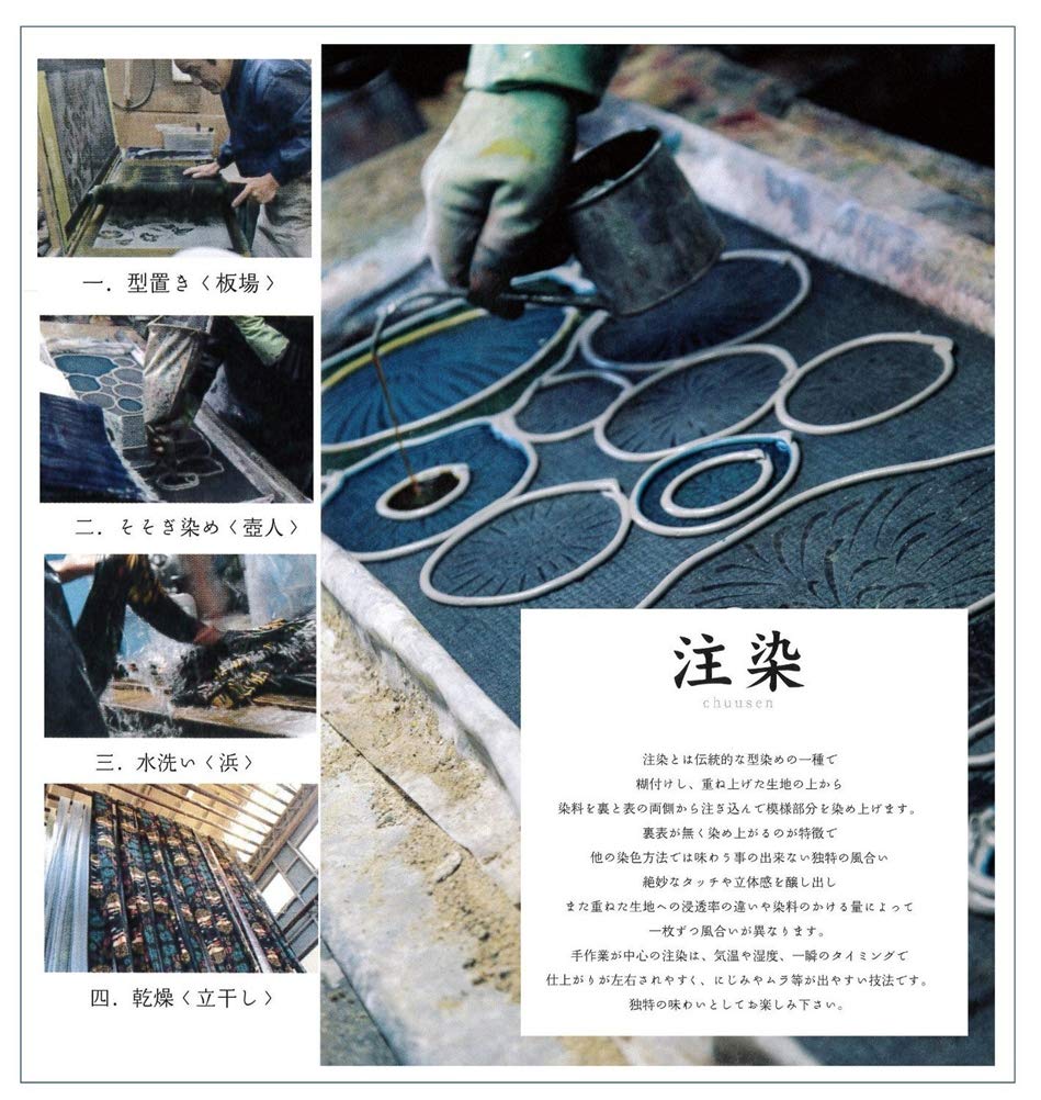 注染(ちゅうせん)技法を用いて職人によって一枚一枚染めている