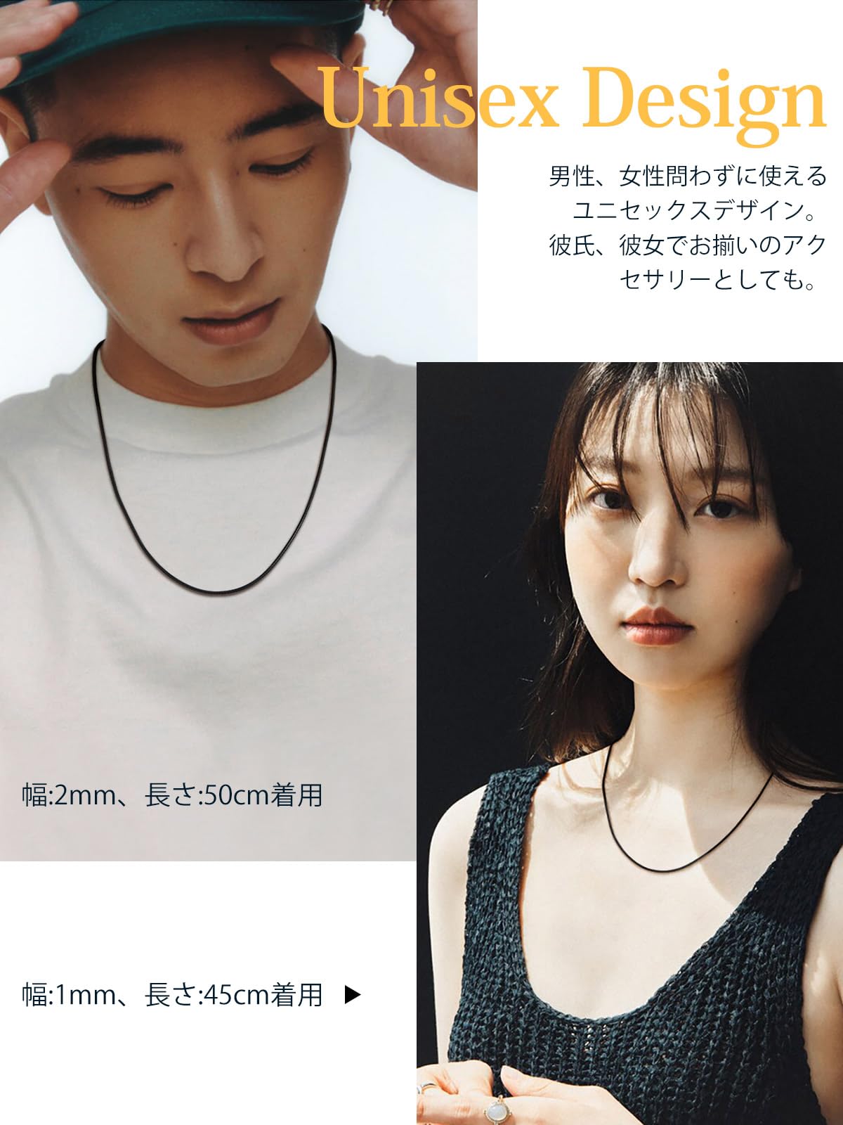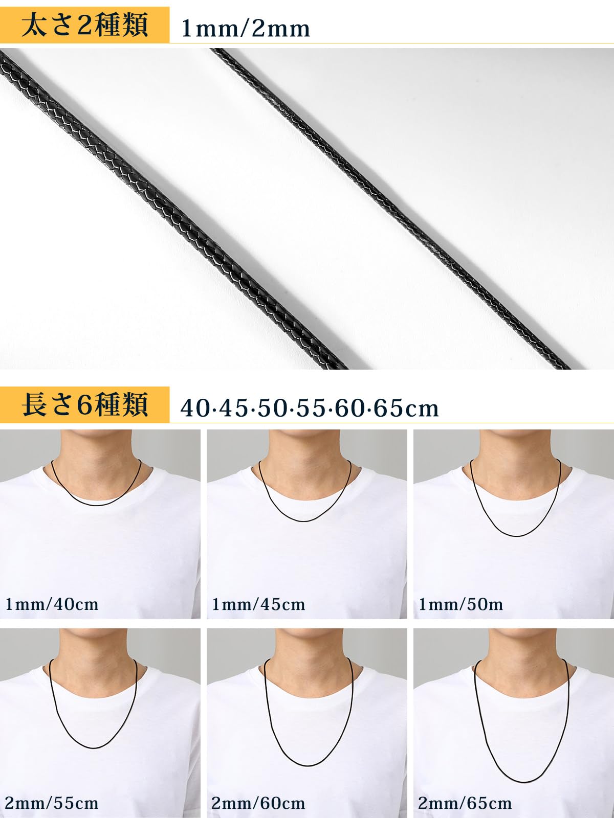 豊かなバリエーション :カラーは人気のブラックをご用意しました。コードは細めの1mmと太めの2mmです。長さは40/45/50/55/60/65cmです。紐ネックレスはどんなファッションにも合わせやすく、太さや長さを変えるだけでも見栄えが違うのでコーディネートが楽しくなります。男性・女性問わずに使えるシンプルなデザインなのでプレゼントにも最適です。