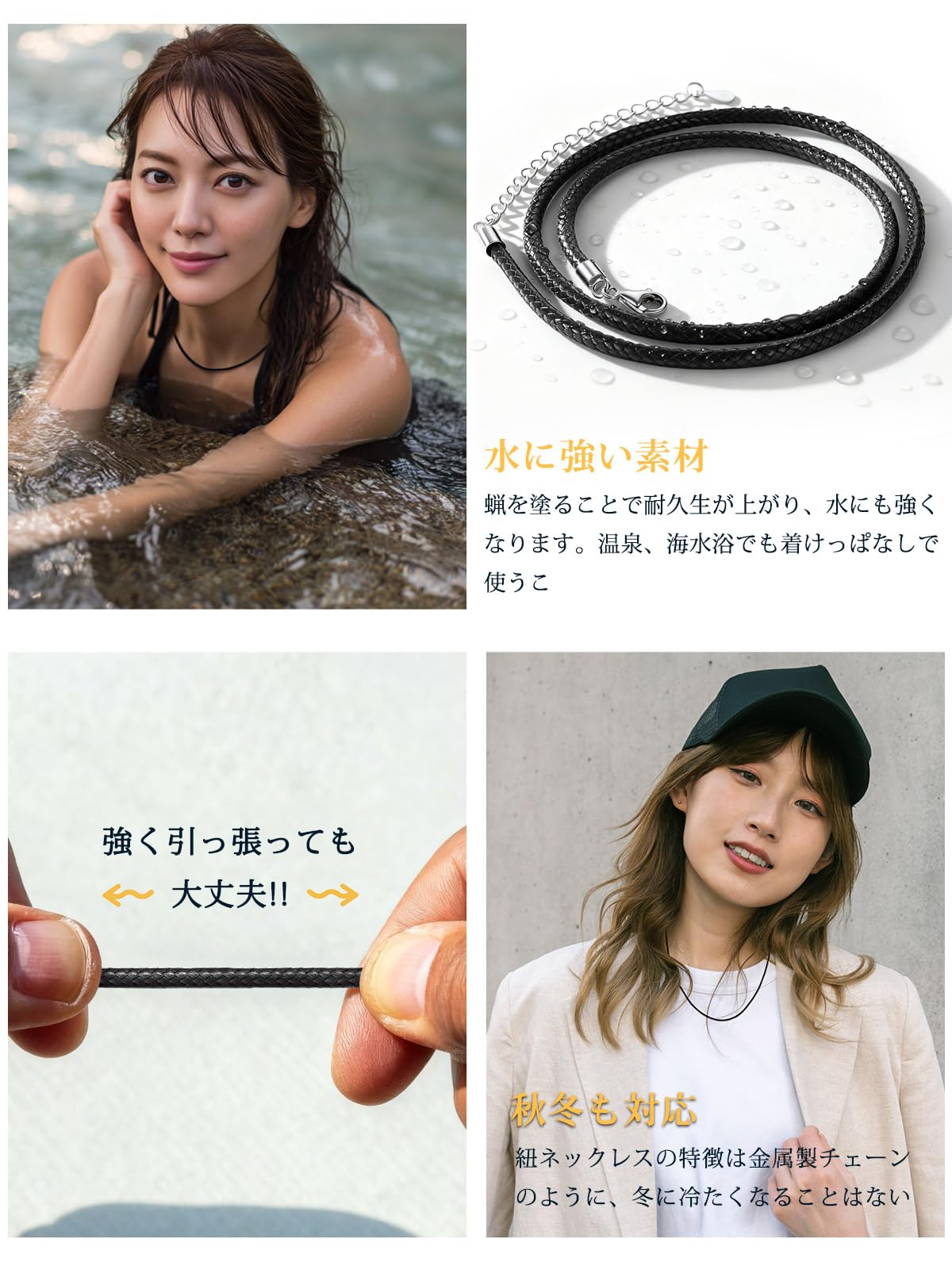 革ひもネックレス:ネックレスの紐にはワックスコードを採用しています。ワックスコードとは蝋引き糸・ロウビキなどとも呼ばれるポリエステル素材にワックス加工した紐です。蝋を塗ることで耐久性が上がり、水にも強くなります。革やレザーより水や汗に強い素材で色落ちの心配もないので海やプール、お風呂やスポーツなど気にせず身に着けることができます。