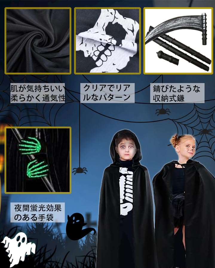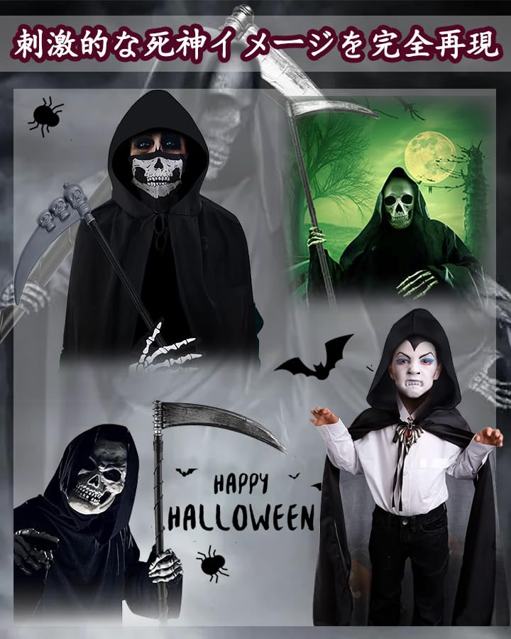 【死神完全なコスプレセット】ハロウィンで人気の死神コスプレセットが登場。5点セットフード付きの死神ケープ、スカルマスク、鎌、スカル手袋(蓄光効果あり)、蓄光ステッカーが含まれています。死神を完璧に再現するアクセサリーがすべて揃っています。これにより、簡単に恐怖感を演出し、ハロウィンやコスプレイベントに最適です。