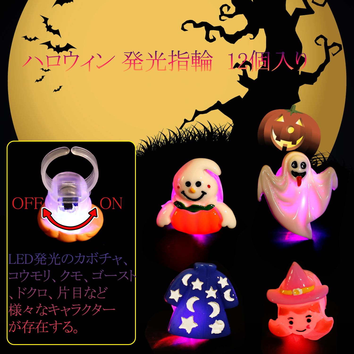 デザイン:LED発光のカボチャ、コウモリ、クモ、ゴースト、ドクロ、片目など様々なキャラクターが存在する。