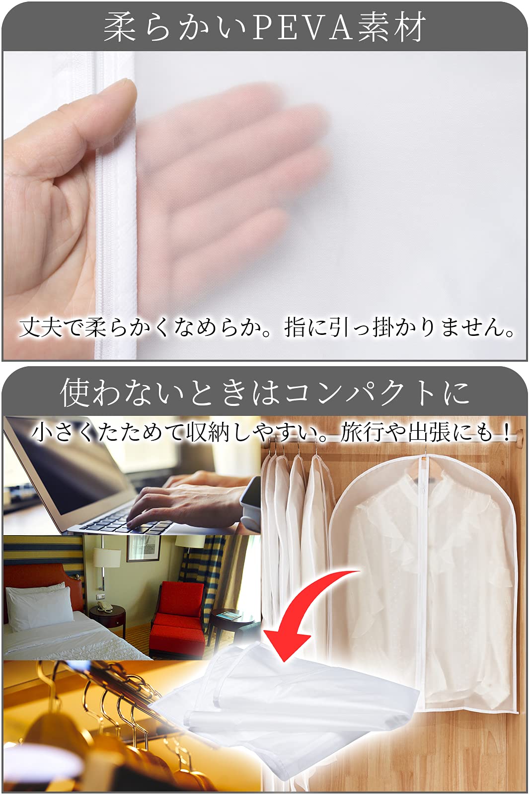 【■優れた防塵性能のPEVA材質】 *注:ハンガーは付属していません*ホコリや汚れをしっかり防ぐ防塵素材。ペットの毛や部屋のほこりから服を守ります。不織布カバーよりも防塵性能が高く、大切な衣類をきれいに保管できます。汚れの侵入を最小限に食い止めるため、ハンガー穴は小さめにし、底部分を縫い合わせました。