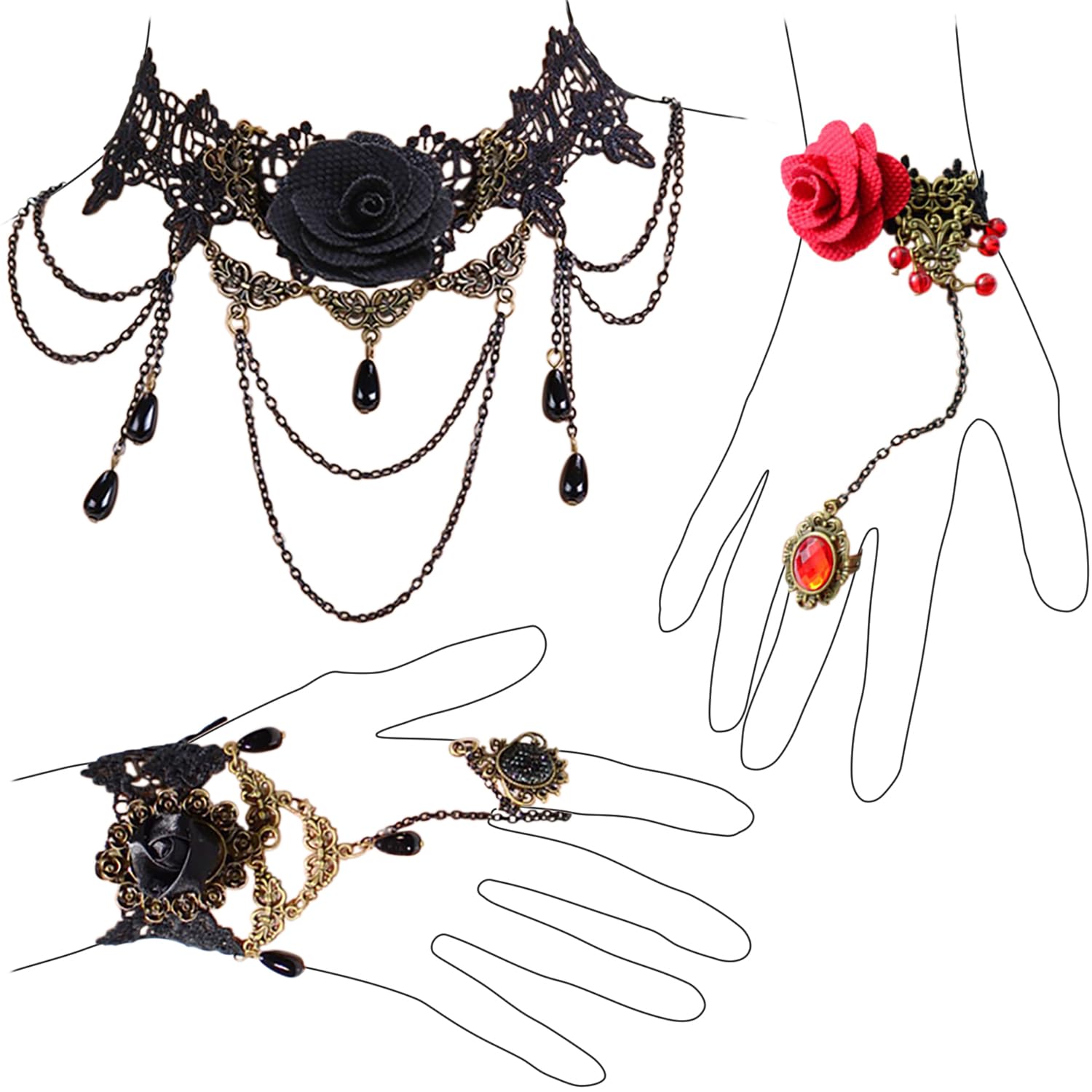 [アリカ] 耽美主義 セット レース 飾りのついた チョーカー リング ブレスレット レース ゴスロリ (Bセット)
