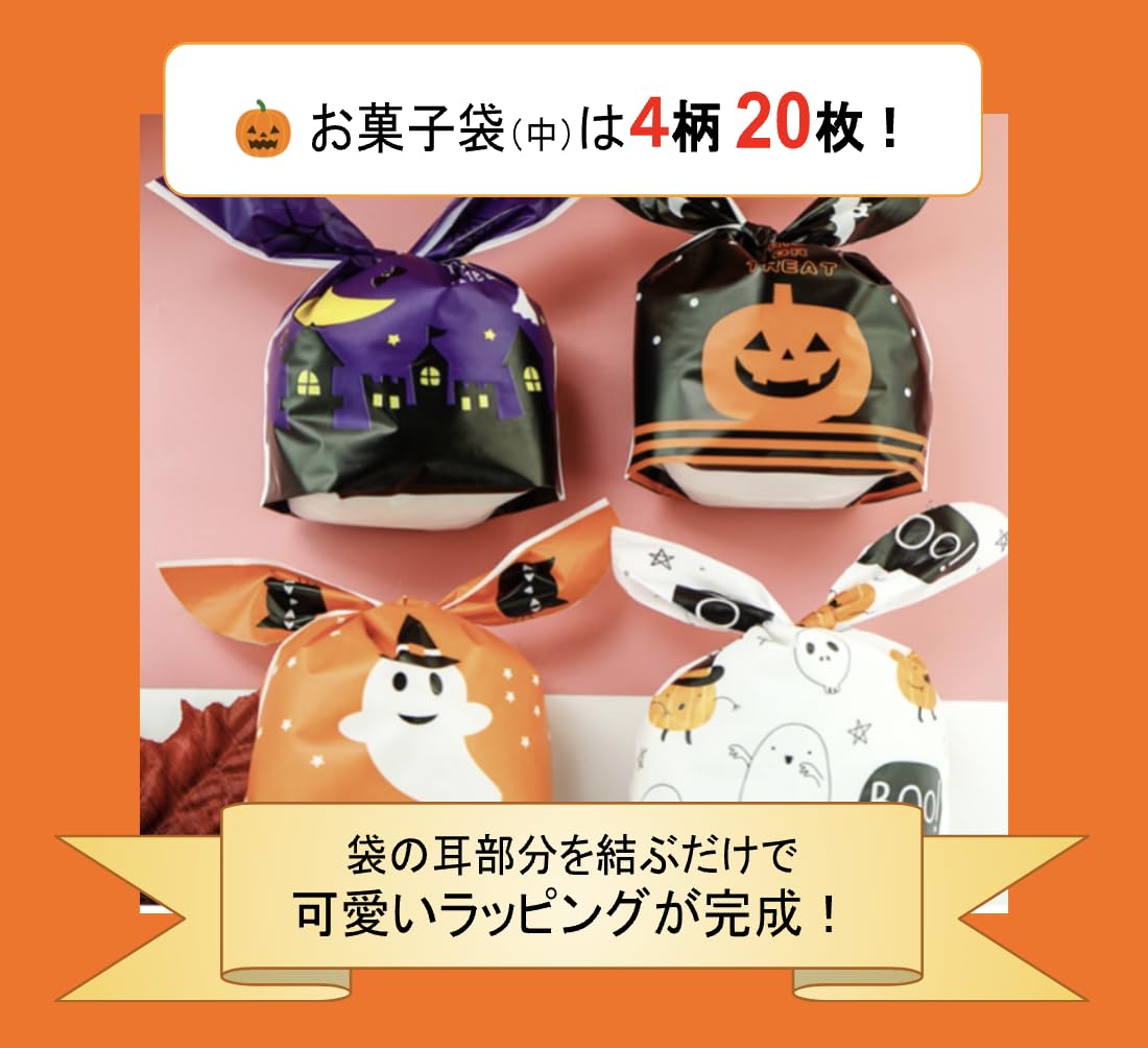 お菓子袋 中 手軽にスピーディにラッピングできるギフトバッグ!2本の長い耳のような部分を結ぶだけで見た目にも可愛いラッピングが完成します。 結ぶだけでお子様でも簡単にラッピングできるので家族みんなでハロウィンの準備ができます。