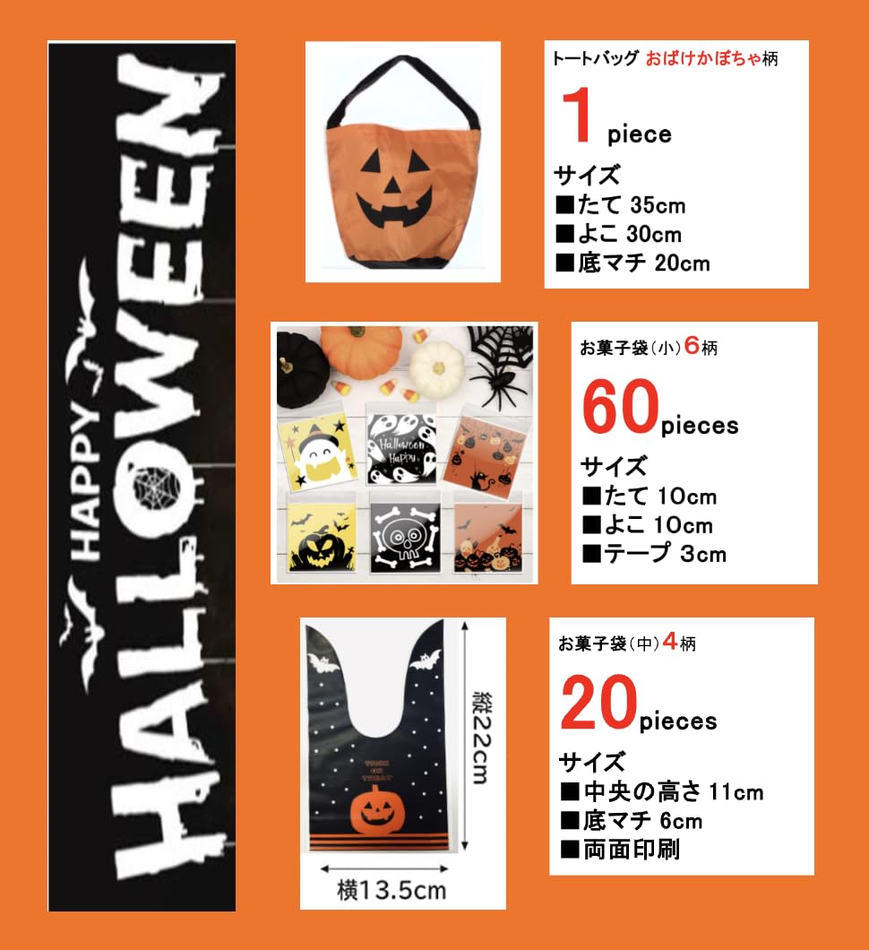 セット内容: お菓子袋(小)60枚 10×10+テープ3cm 、お菓子袋(中) 20枚 13.5×22×マチ6cm 、トートバッグ 1枚 35×30×マチ20cm