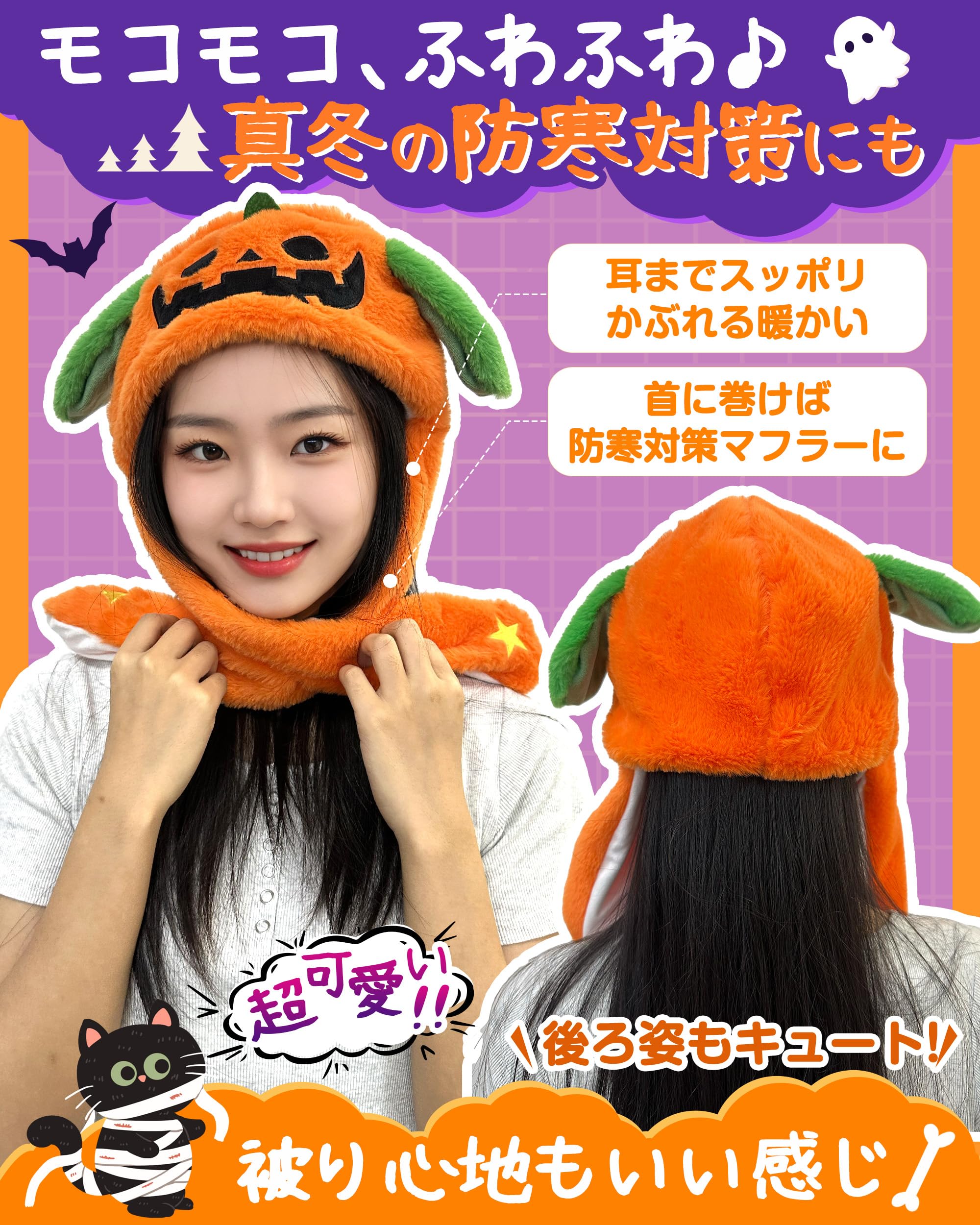 【キッズ~大人までOK】頭周り約60cmなので子供でも大人でも楽しめます。子どもがゆったりと着用しても、ゆるい表情とふわふわの触り心地が癒しの時間を与えてくれます。首のところで簡単にとめられるのでお子様でも安全な使用します。みんなで一緒にハッピーハロウィン!!