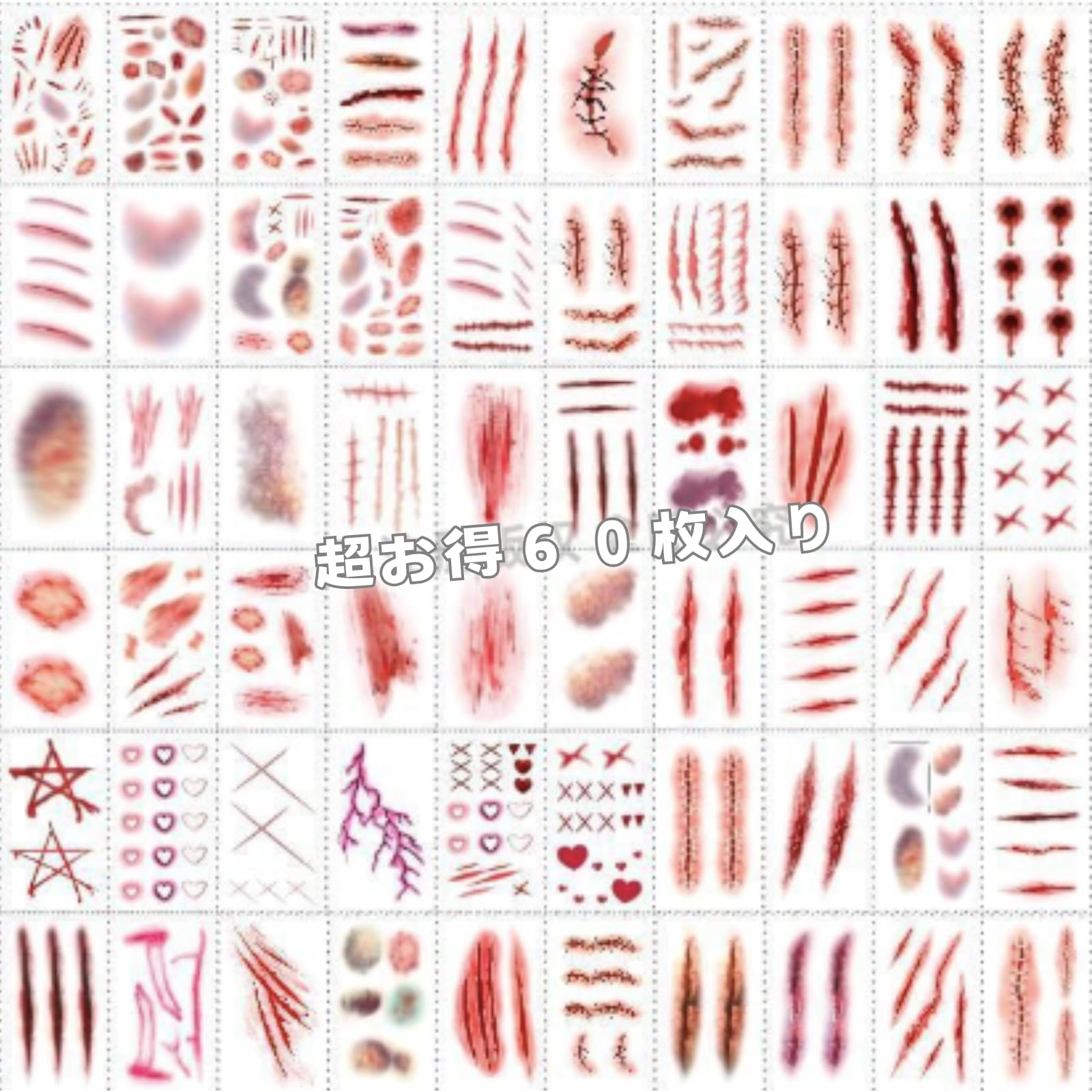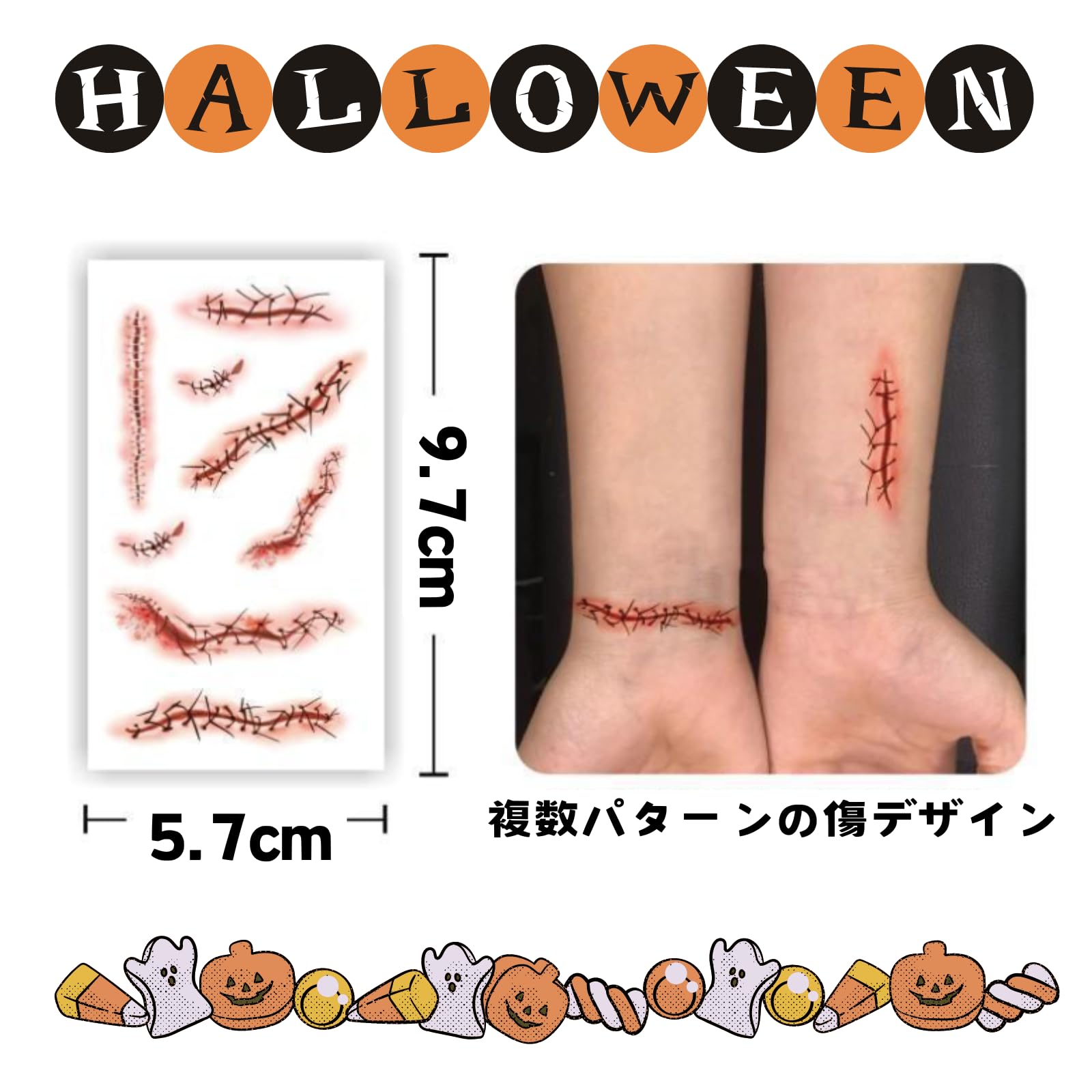 ハロウィンなどのイベント、クラブ、お祭り、肝試し、ドッキリ、パーティーの仮装用、特殊メイク用に使えるタトゥーシール。キズや血のり、歯形シールなどがありゾンビメイクにピッタリ。顔や腕や足、体や背中等、お好きな場所に貼ってください。