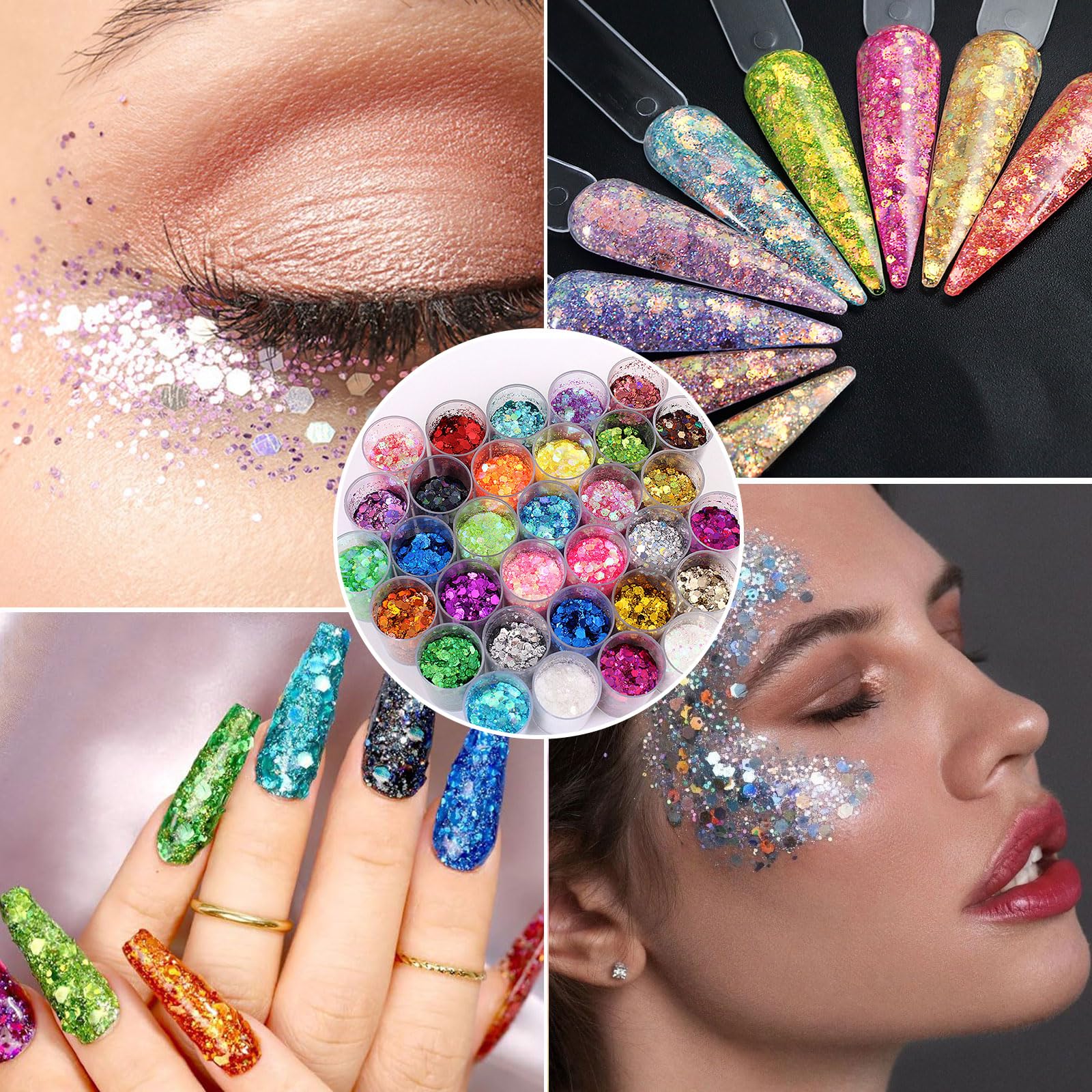ネイル グリッター 32個セット キラキラ ラメグリッター ネイルパーツ ホログラム ジェルネイル ラメパウダー 極薄 ネイルアート レジン 封入パーツ 顔 ボディ ヘア飾り ハロウィン 新年 クリスマス パーティー (マルチカラー D)