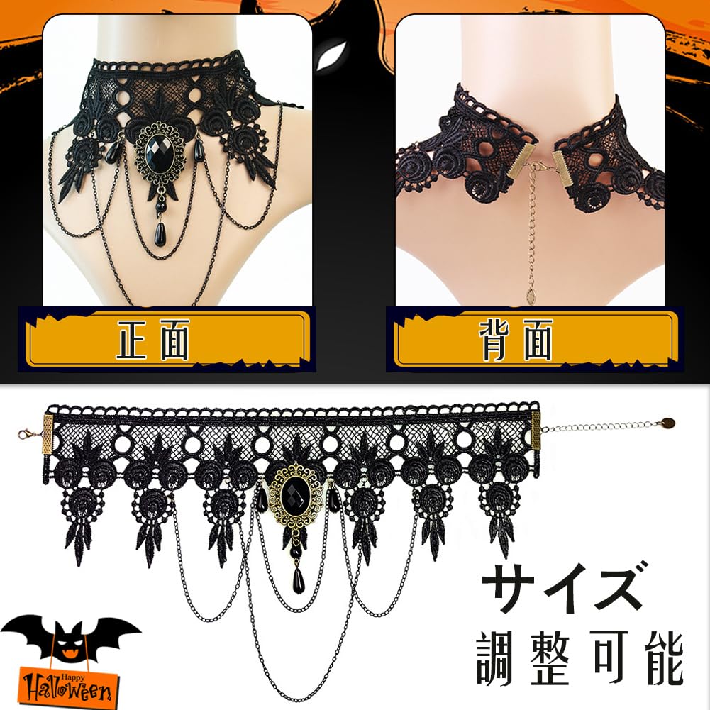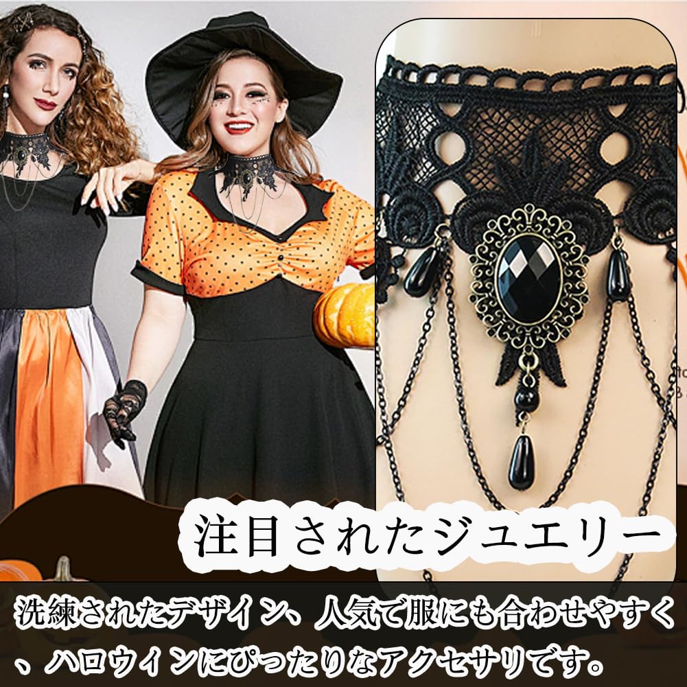 おしゃれ:シンプルなレースとチェーンを使用したチョーカーネックレスになります。首元をすらりと美しく見せたり、顔周りを華やかに演出し、美しく見せます。中央のジュエリーが一番注目されたポイントです。洗練されたデザイン、人気で服にも合わせやすく、ハロウィンにぴったりなアクセサリです。
