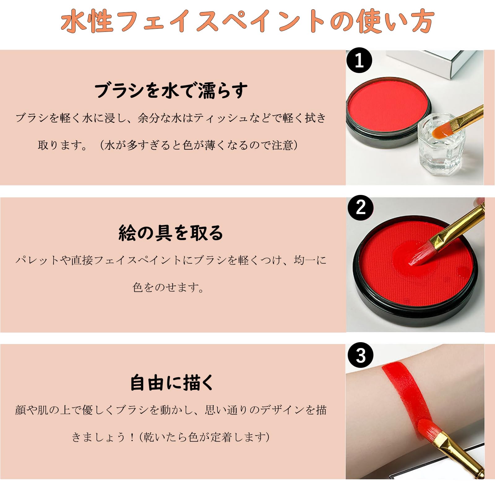 水性タイプ: 肌に優しい水性フェイスペイントで、簡単に塗布・洗い落としができます
