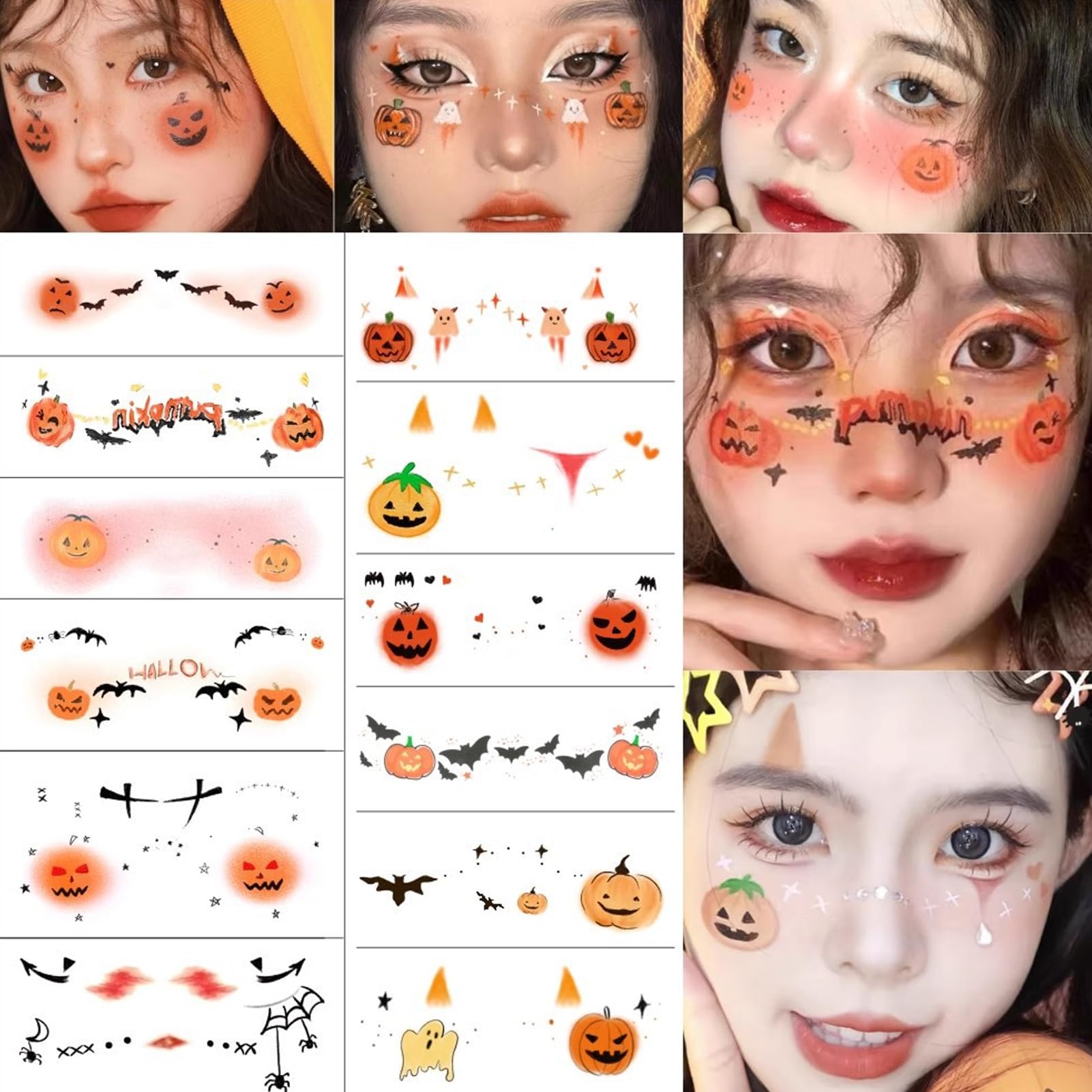 【特価セール】ハロウィン タトゥーシール 水転写式タトゥー フェイス 顔全体 コスプレ フェイスシール 男女兼用 仮装 キッズ メイク かわいい ステッカー シール 小物 幽霊 かぼちゃ コウモリ (タイプ2) | libertyislan