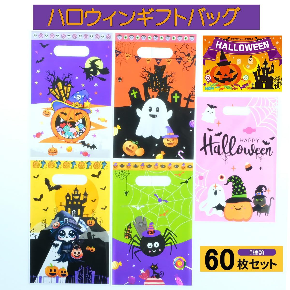 ✨【デザイン5種類】ジャックオーランタン×パープル、ゴースト×オレンジ、ゴースト×イエロー、スパイダー×グリーン、ジャックオーランタン×ピンクの合計60枚セットです。
