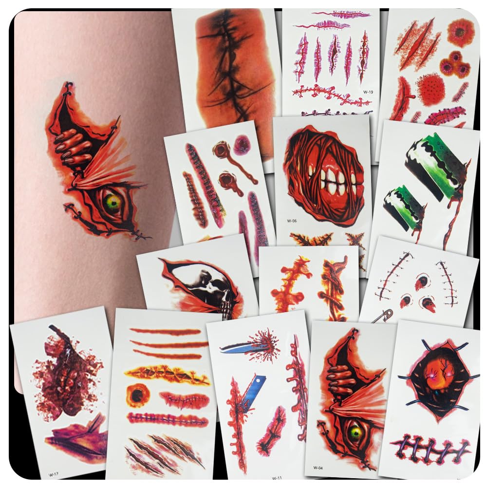 【リアルなデザインで大注目】特殊メイク効果のあるリアルなタトゥーシールです。シールの質感も非常にリアルで、貼るだけで特殊メイク感がグッとアップし、男女問わず周りを驚かせることができます。フェイスやボディのアートメイク、ハロウィンパーティーに最適なアイテムです。細部までリアルにデザインされた痛々しい傷口を簡単に再現できるので、「本当にケガしたの!?」と思わせるほどの完成度です。思わず「リアル過ぎ!」と叫びたくなるようなデザインをお楽しみください。【ハロウィンを盛り上げよう!】とてもリアルなので、お子様のハロウィン仮装にはもちろん、大人の方にもおすすめです。手軽に本格的な特殊メイクを表現できるため、ハロウィンパーティーだけでなく、お祭り、ライブ、クラブ、肝試し、サプライズ企画など、様々なシーンで大活躍します。なお、ゾンビメイクや特殊メイクにぴったりのフェイスシールで、貼るだけで手軽に雰囲気を盛り上げられます。手のひらやマスクに貼っても面白いですよ。