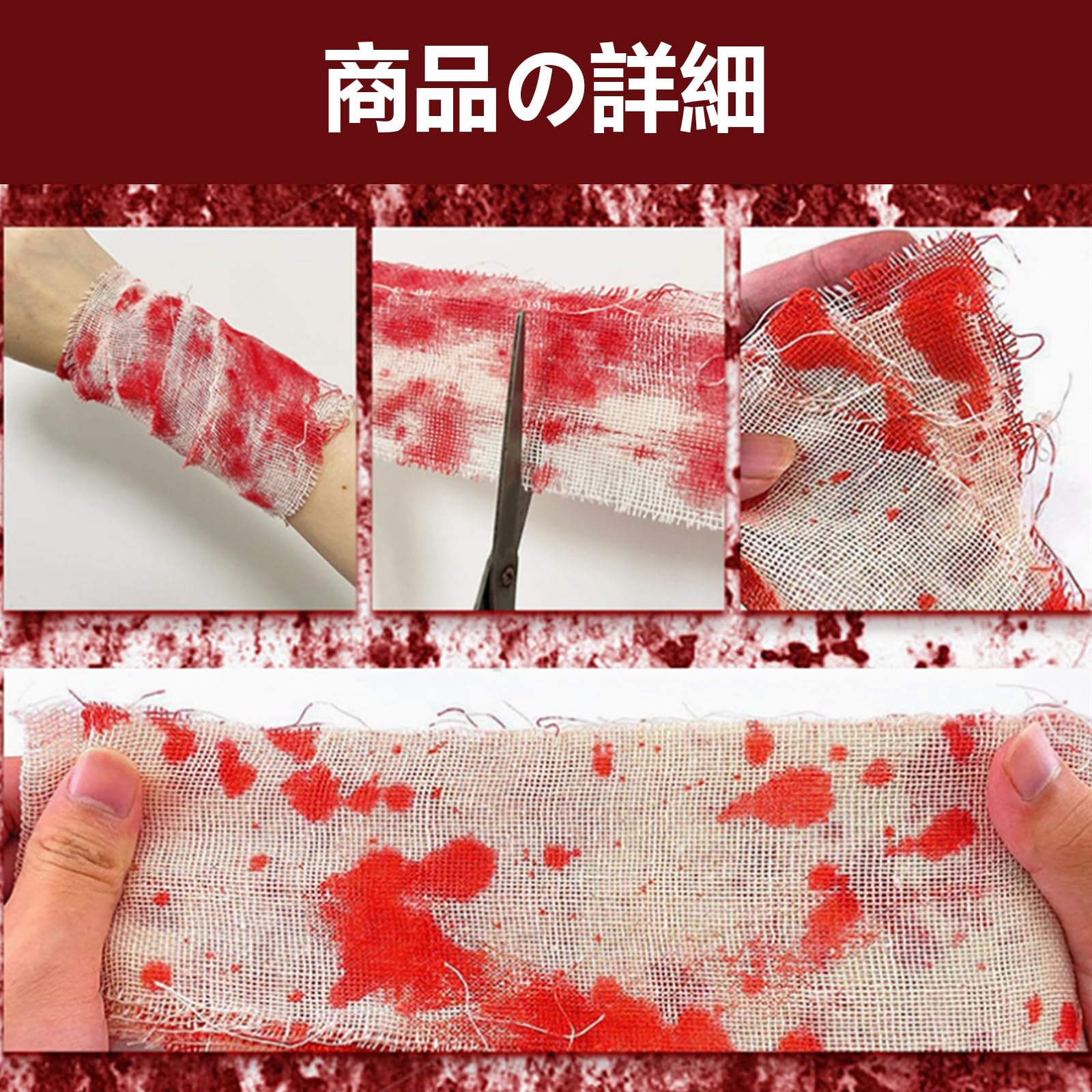 これはハロウィーンやコスプレなどのシーンで使用できる血塗れ布です。サイズは 8cm×5mで、必要に応じてハサミで好みの長さにカットできます。セット内には合計4巻入っています。高品質のコットンガーゼ素材を使用しており、安全で耐用性があり、繰り返し使用可能です。