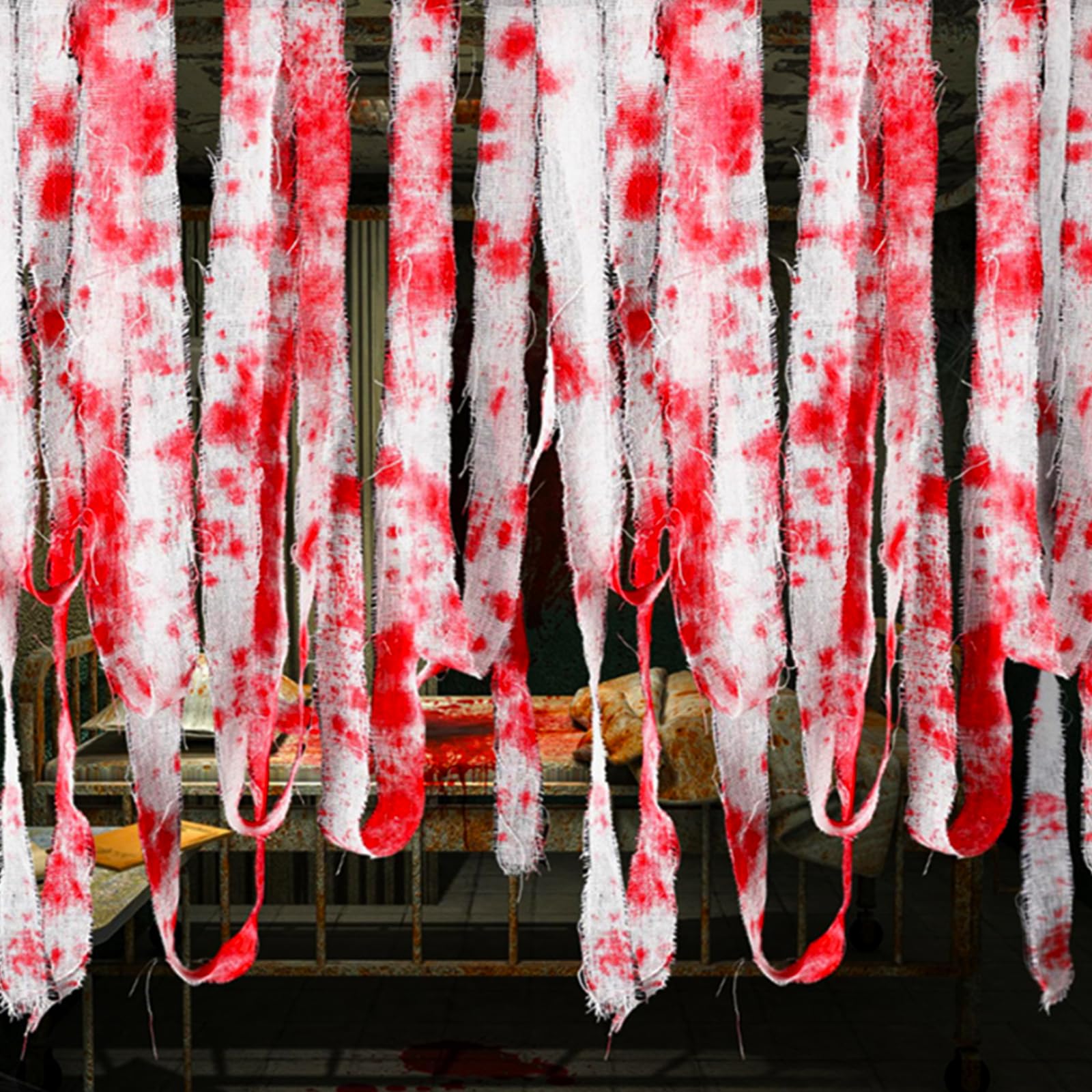 【不気味な雰囲気】柔らかくやや緩んだ血塗れ布の特徴は、生地の質感がぬるまんじゃない血糊を染み込ませ、傷口から垂れる血のようなリアル感を演出できることです。ゾンビメイク時には頬や首に絡めると、動くたびに布がゆっくり揺れるさまが、一層不気味な雰囲気を醸し出します。