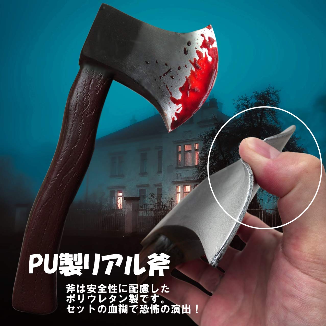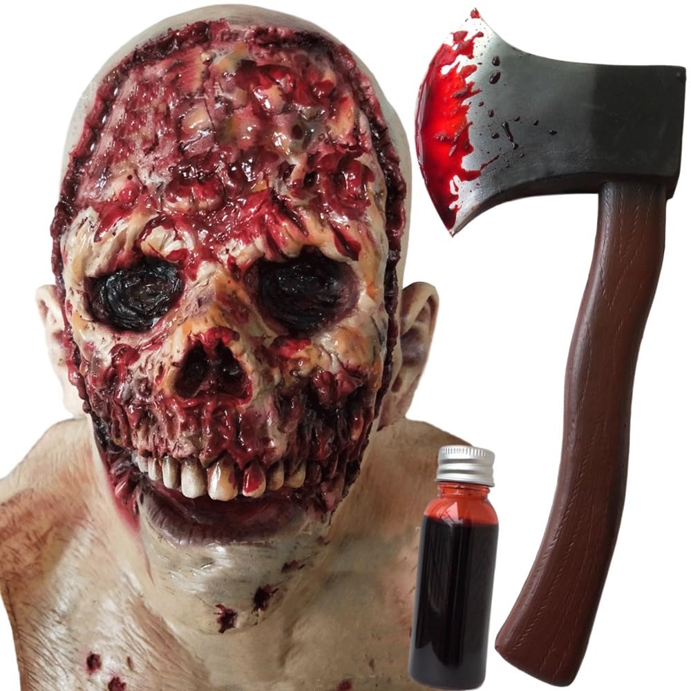 ラテックス製ゾンビマスク、PU製模造斧、血糊、保管用遮光撥水バッグ