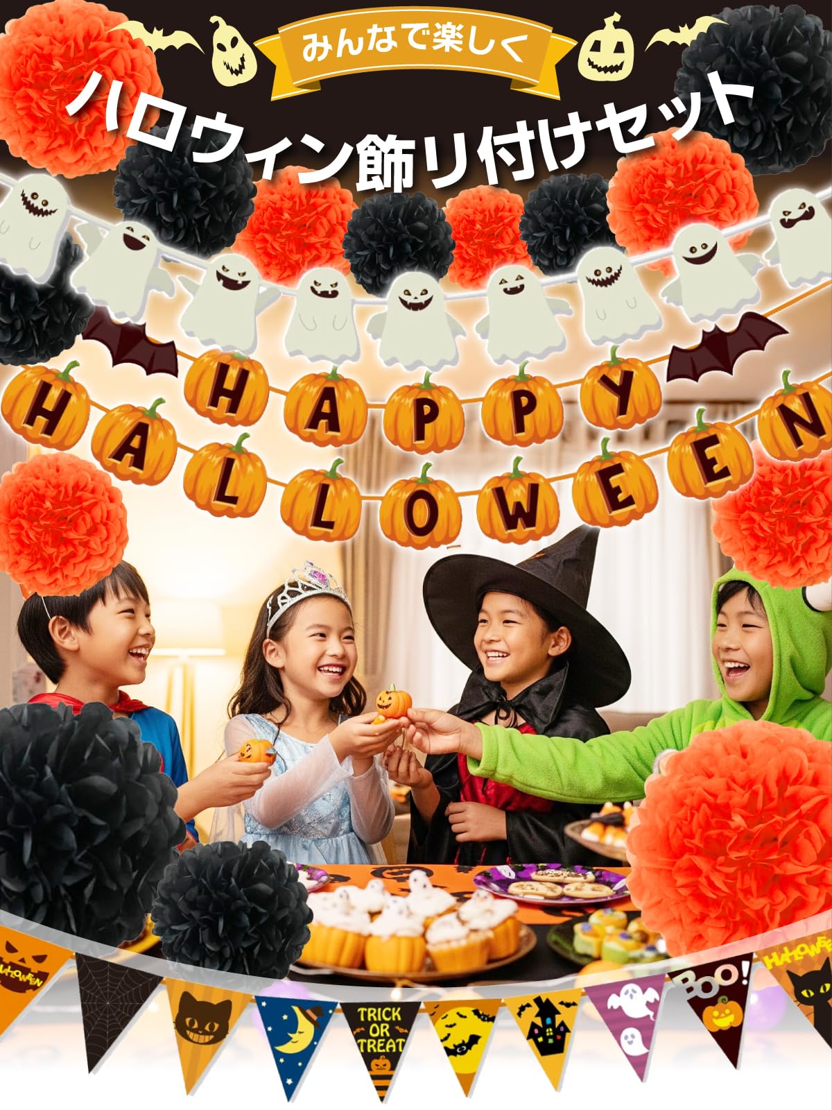 デコレーションセット内容:ハロウィンテーマのガーランド3種類(パンプキン・ゴースト・トリック・オア・トリート)、オレンジ&ブラックのペーパーフラワー、ドア用ペンダント壁飾りが含まれています。