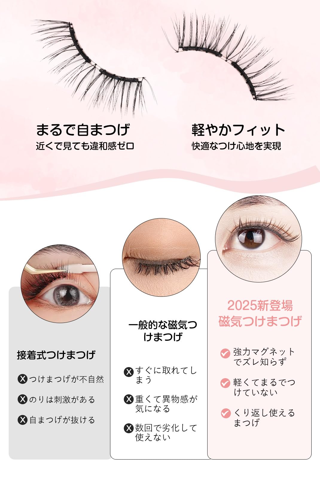 【肌にやさしいマグネット式】最新のマグネット技術を採用したつけまつげで、接着剤を一切使用せず、肌への刺激やベタつきのご心配は不要です。まぶたに優しく、装着や取り外しも簡単で、初心者の方でもスムーズに使用可能。自然なフィット感と快適なつけ心地で、目元に負担をかけず、ストレスのない美しさを叶えます。