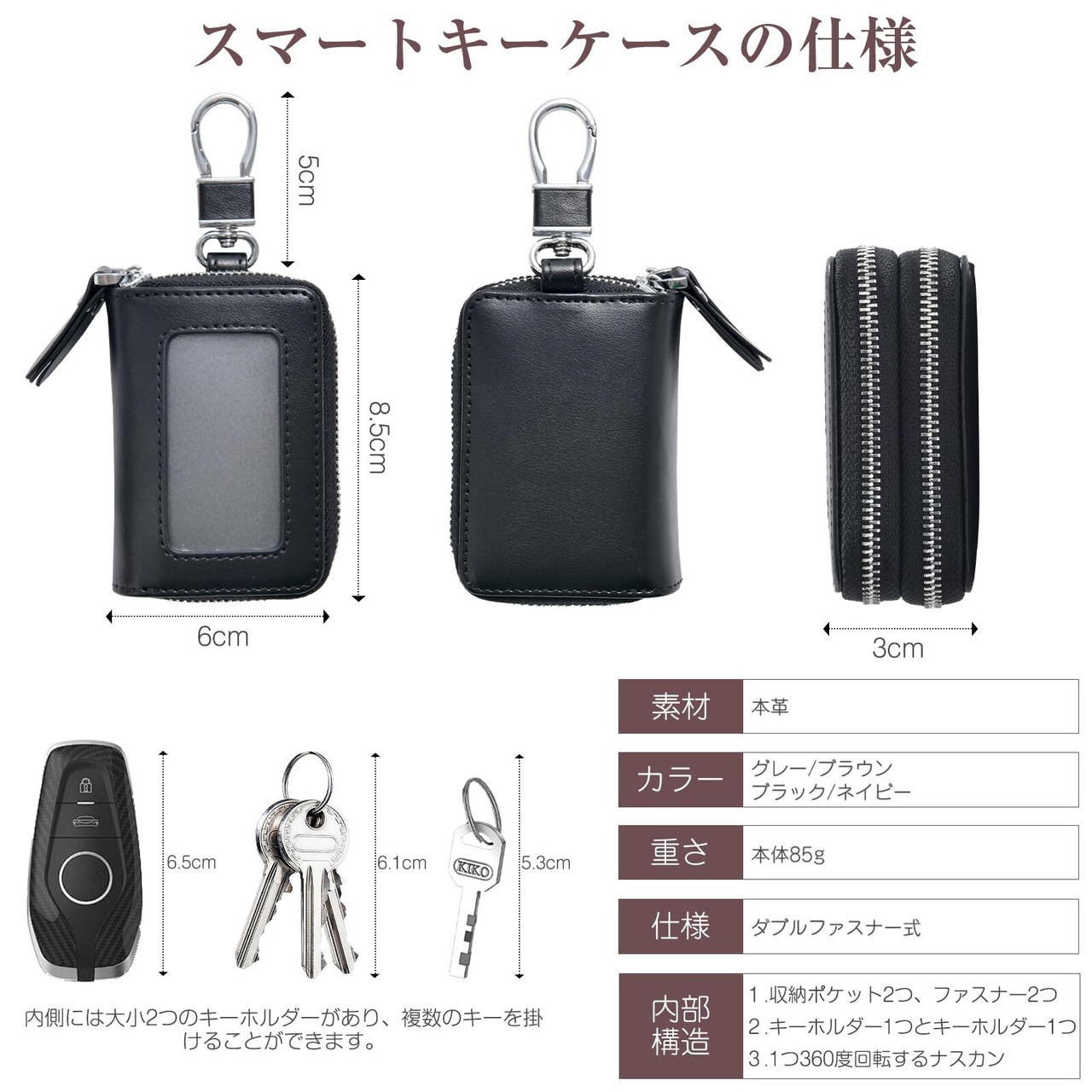 【車キーケースの商品仕様】サイズ:長さ10cm×幅6cm×厚さ4cm、重さ約80g。ファスナー付フリーポケットⅹ2、チェーン付きキーリング×2、360°回転カラビナ付き×1。4色展開:グレー、ブラウン、ブラック、ネイビー,カラフルで持つだけで楽しくなるスマートキーケース。スタイリッシュでおしゃれな方のマストアイテム。ならではの高級感、スムーズレザーで長く持っても傷が目立ちにくいのもうれしいポイントです。車のキーや鍵を簡単に収納でき、コンパクトなデザインでポケットやバッグにすんなりと収まります。 耐久性のある素材で作られ、長時間の使用に耐える美しさと実用性を備えています。