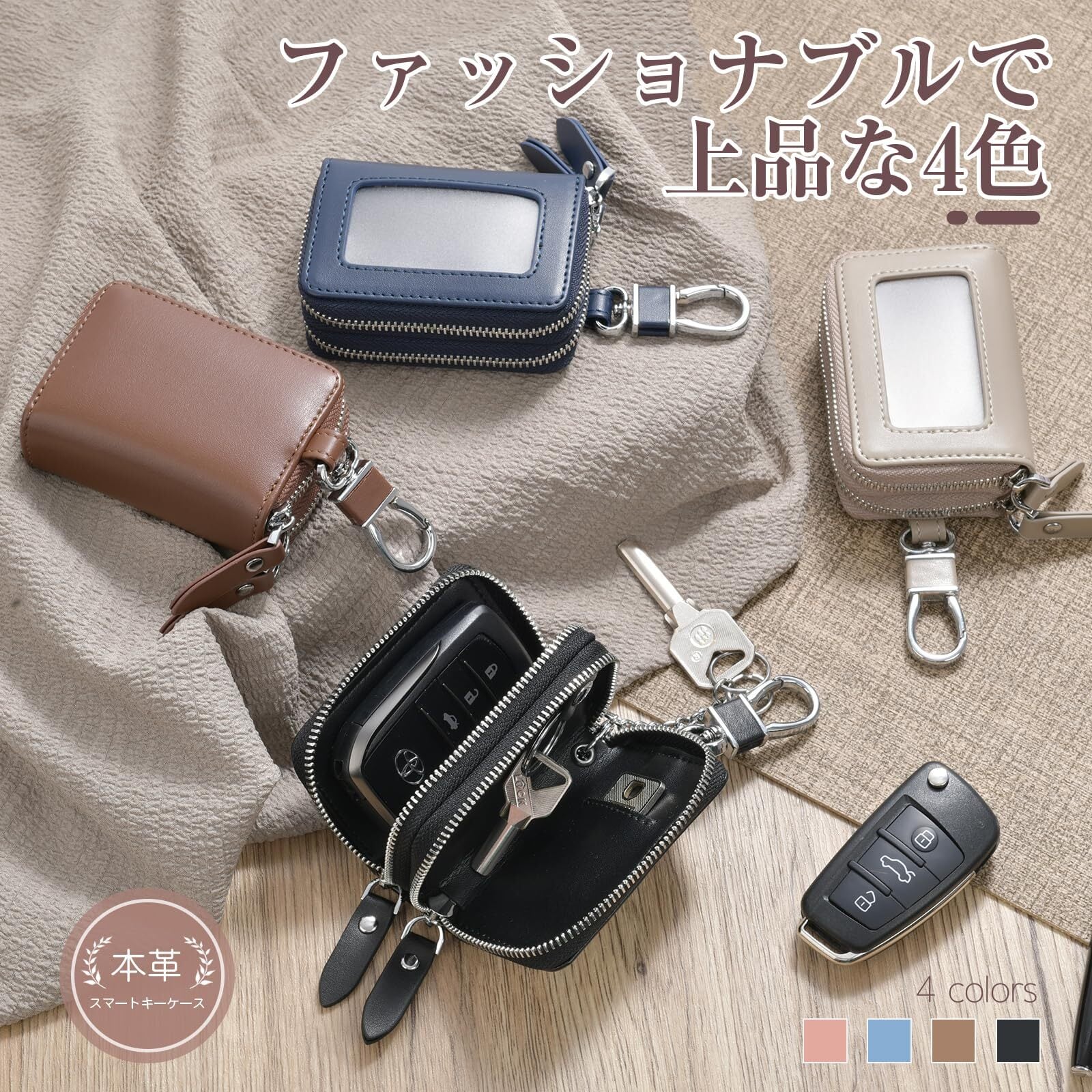 【2022最新】[YooFa] 本革 スマートキーケース 2個収納 メンズ レディース ダブルファスナー 車キーケース 牛革 通勤 おしゃれ クリア窓付き 鍵 カラビナ付き レザー スマートキー対応 カバー型 プレゼント | libertyislan